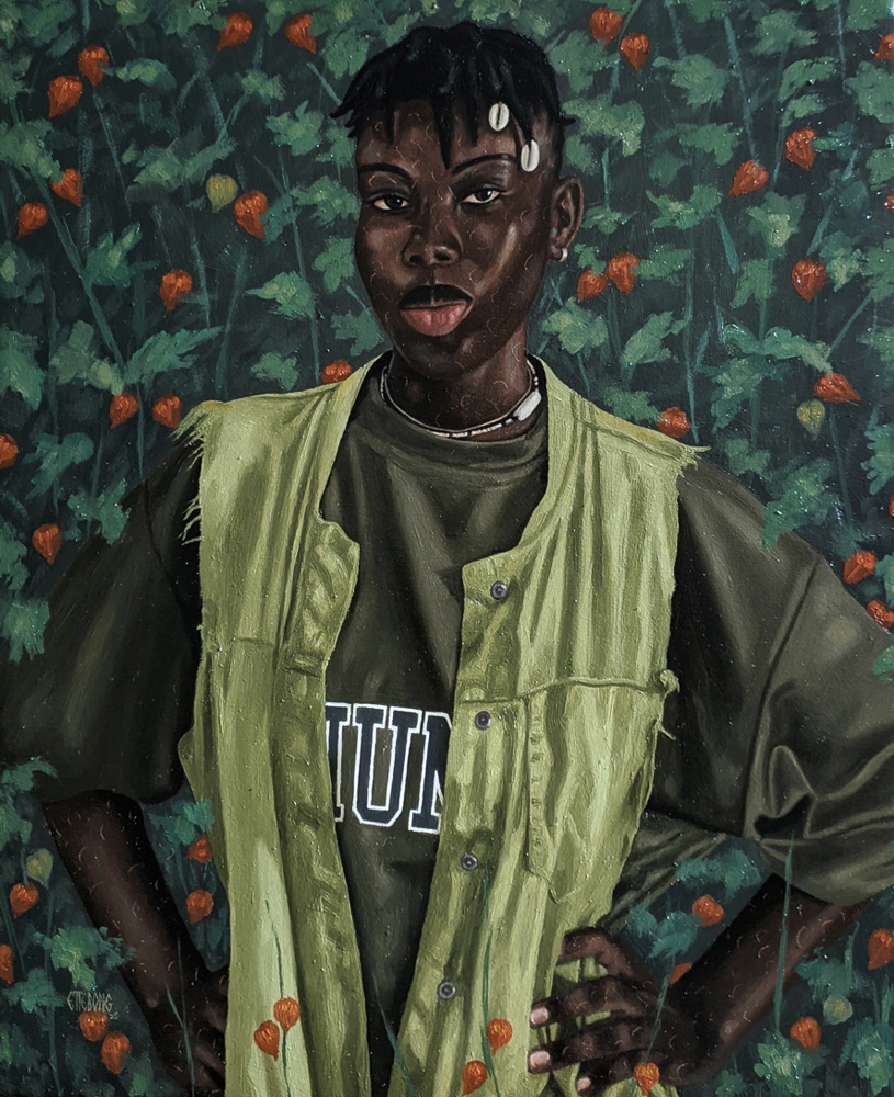 This oil painting portrays a confident young girl standing against a lush backdrop of green foliage dotted with vivid orange blooms. Dressed in earthy tones and accented with cowrie shells in the hair, the subject radiates quiet strength and individuality, embodying growth, resilience, and self-assured presence amid nature’s abundance.