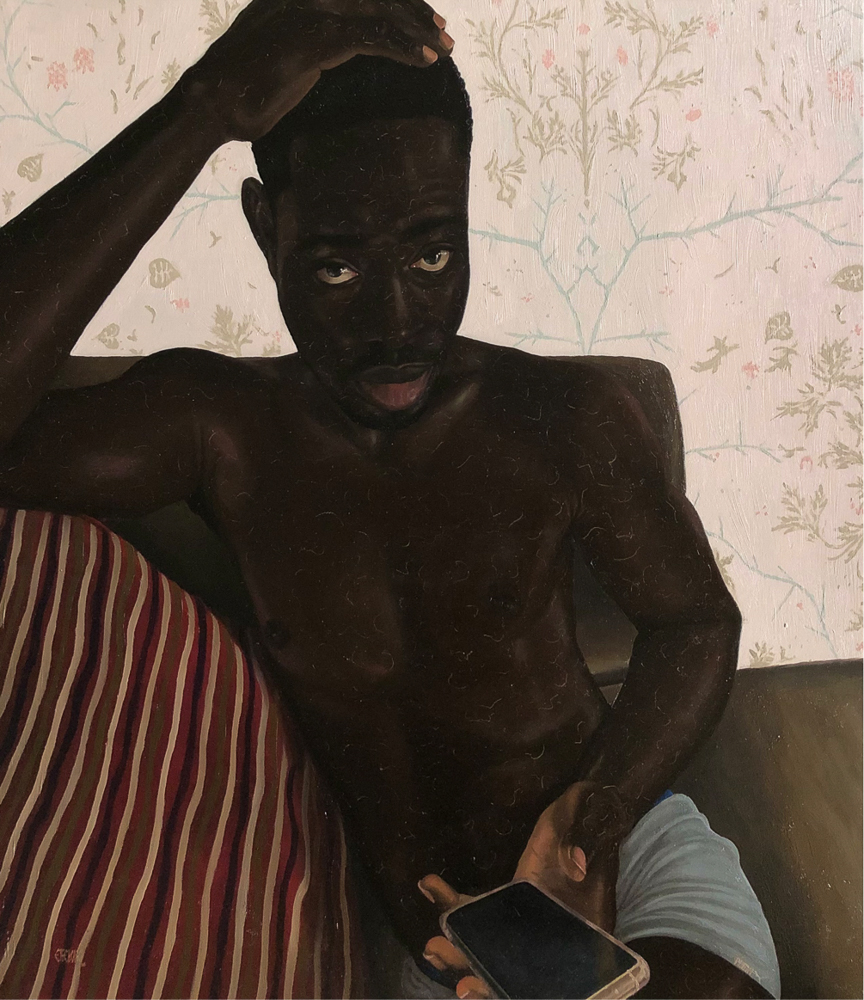 “Unfiltered Courage” is an intimate painting of a shirtless man seated against a softly patterned wall, one hand resting on his head and the other loosely holding a smartphone. His direct gaze meets the viewer’s, carrying a quiet defiance and vulnerability. The warm tones of his skin contrast with the muted floral backdrop and the bold stripes of the cushion beside him, creating a portrait that feels both raw and contemplative.